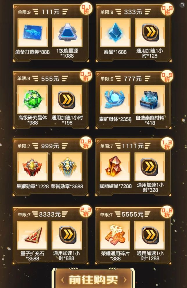 活动期间,玩家可购买以下档位的礼包,最低0.1折,助力指挥官们战力飞升。