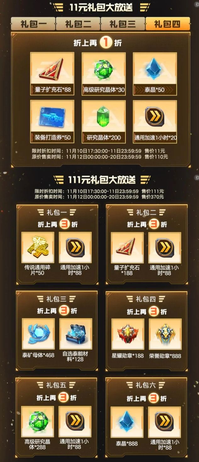 限时礼包包括11元礼包与111元礼包!折上再打折,全年仅此一次,指挥官们不要错过!