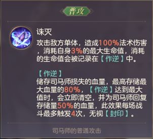 核心机制“作逆”,司马师的普攻、怒攻会消耗自身生命值,储存在一个单独的池子中,类似于把生命值存了起来,可以在关键时刻给自己或者队友奶一口,当然更大的作用在于司马师的其他技能都和这个血池的数字紧密相连。