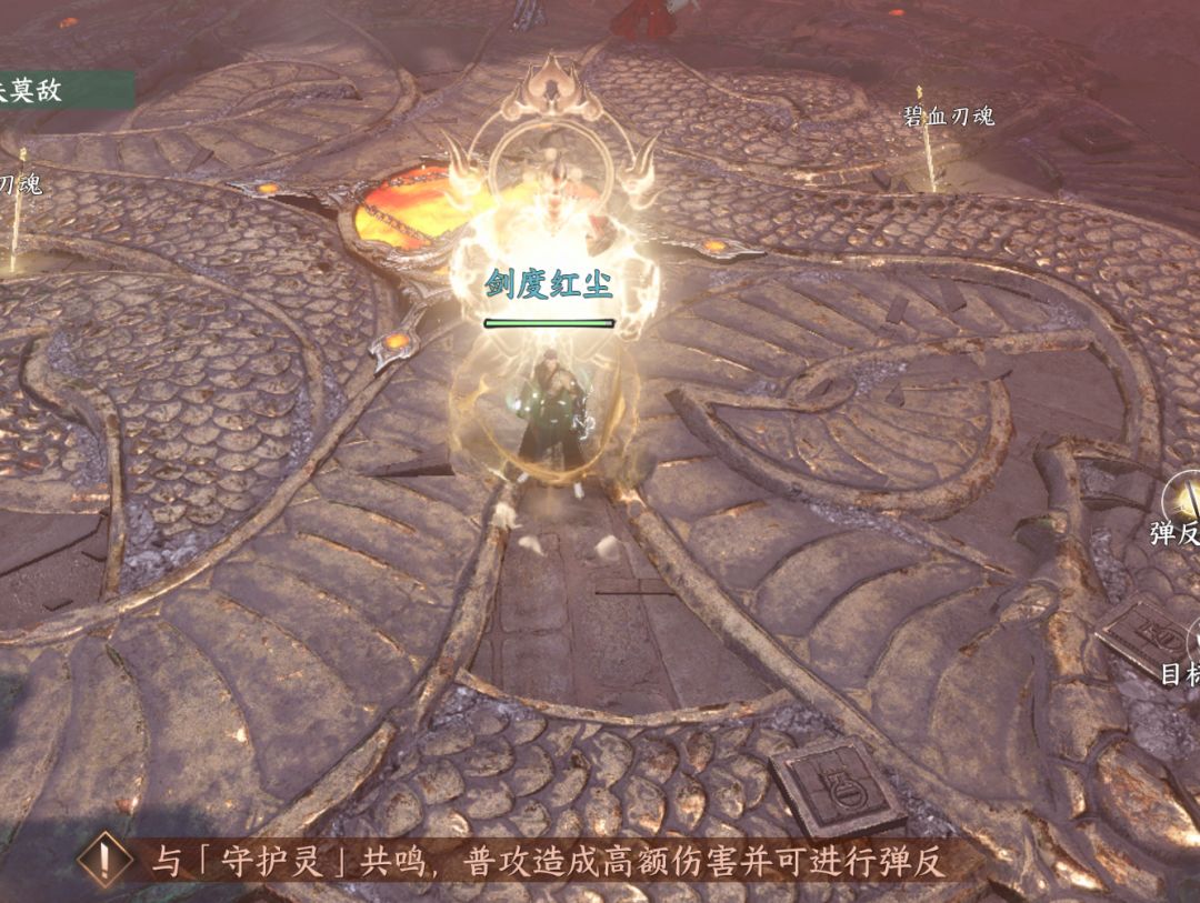 拥有碧血刃魂状态的玩家进入橙色圈内进行弹反,切记,没有刃魂状态的不要去,会秒死。注意:橙色圈内陨石下落速度较慢,注意把握时机,另外组队状态下,会出现两个橙色弹反圈,记得提前沟通进入弹反。