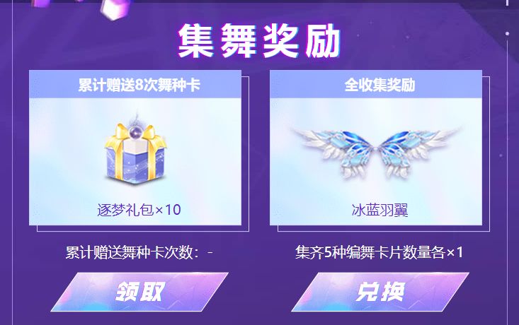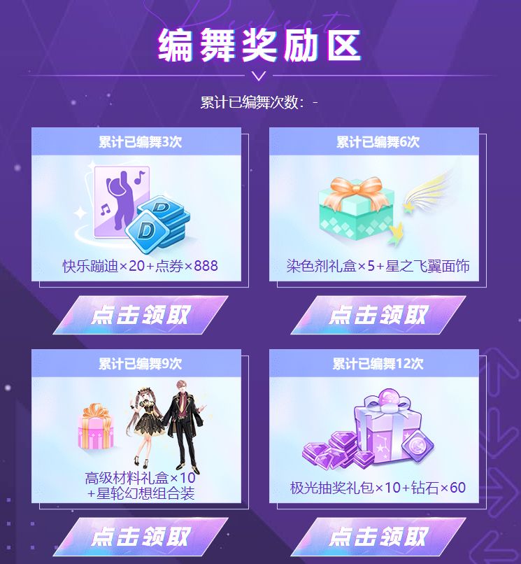 11月11日至11月24日期间,玩家通过邀请舞团成员/完成页面任务获得万能/随机编舞次数(符合舞团成员身份条件为:2023年11月11日0点后新注册账户的玩家或2023.11.4-2023.11.10未登录游戏的玩家),完成玩法编舞环节达到指定要求可领取逐梦礼包*10、冰蓝羽翼、钻石*60、星之飞翼面饰、星轮幻想组合装等奖励。