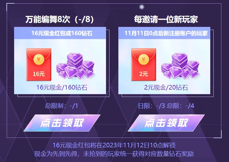 累计万能编舞8次可得16元现金,每邀请一位新玩家还可领取2元现金(16元现金奖励将于11月12日10:00开放领取;新注册账号的新玩家需为11月11日0点之后注册,邀请新注册账号的新玩家的奖励单日限制领取3次,总限制领取4次)~现金红包为先到先得,未抢到的玩家统一获得钻石奖励。