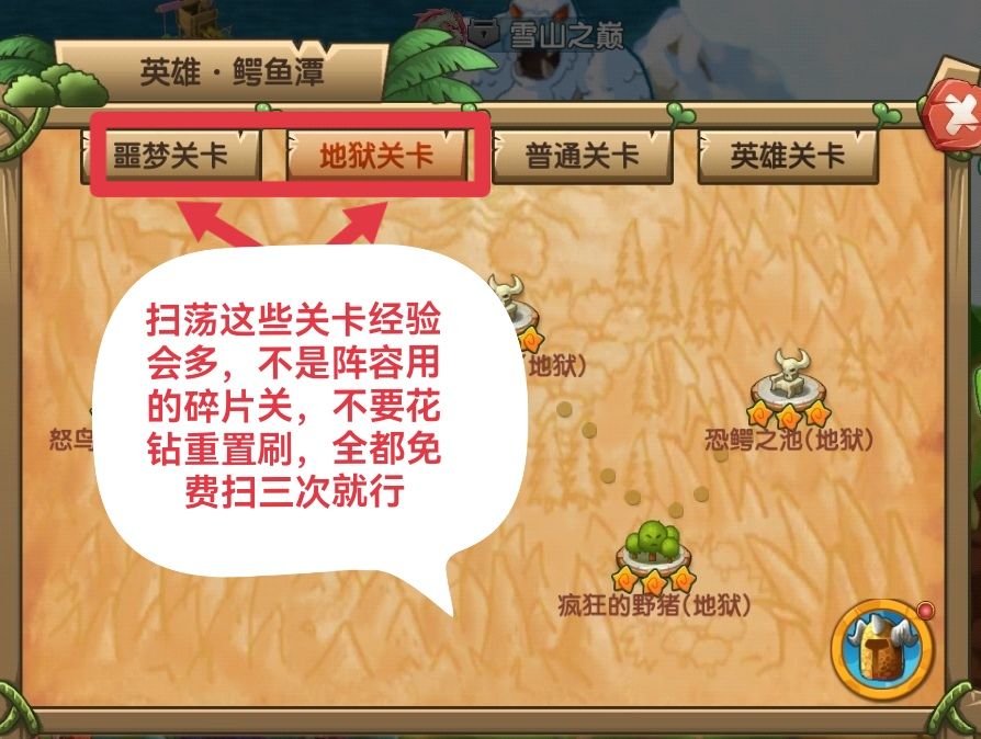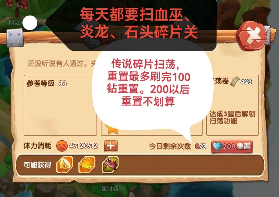 图4图5:主要是扫图说明,扫荡地狱和噩梦关卡经验多。刷碎片重置最多重置完100钻,200以后重置不划算,省下来的钻石抽十连不香么?