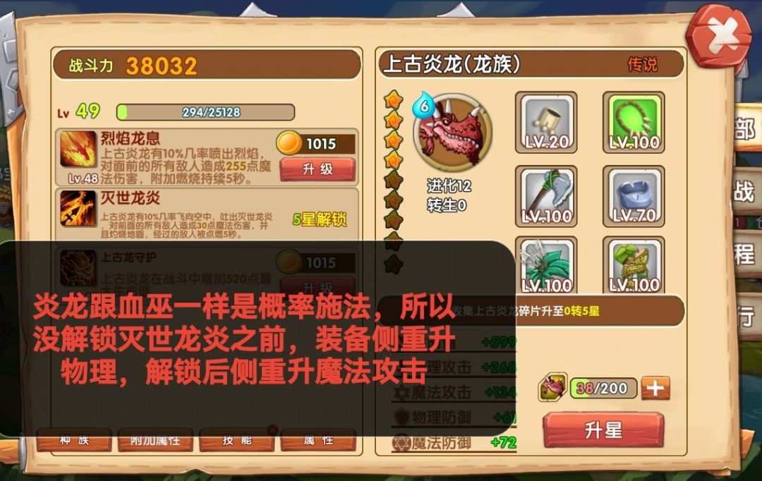 炎龙:五星之前物理攻击100级,魔法攻击和破防50级,生命和双抗100级。五星以后,魔法攻击生命值200级,双抗150。破防不要升太多,最多100。