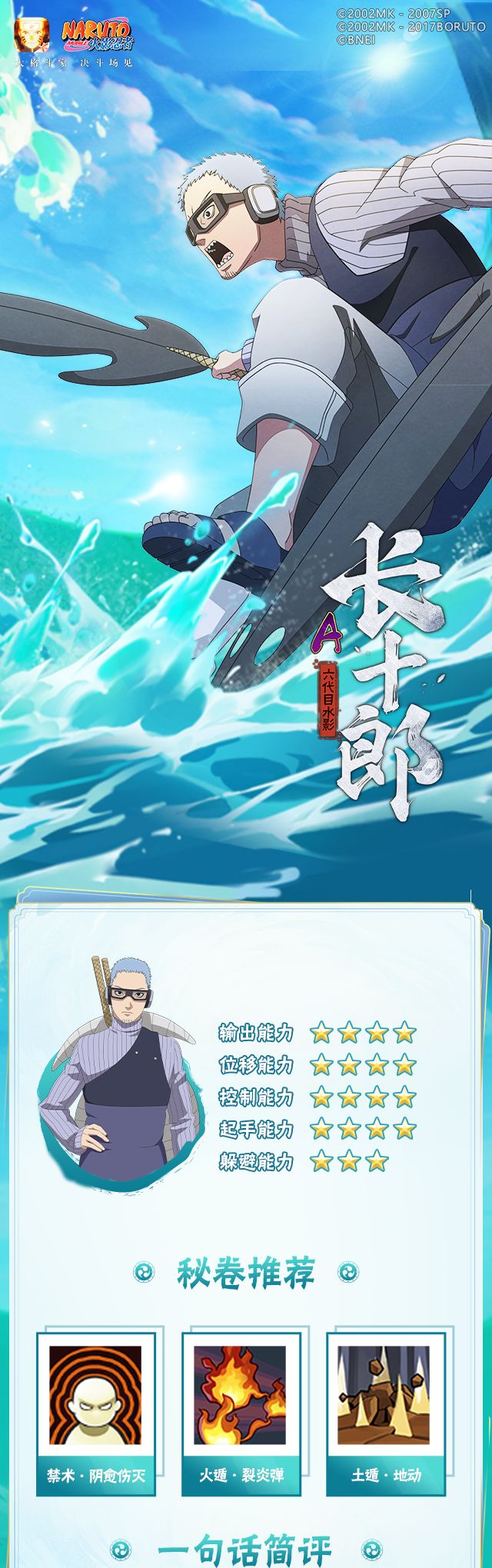 长十郎「六代目水影」可以在单刃形态与双刃形态中自由切换,单刃形态伤害高、爆发强,双刃形态连击灵活,是一位下限与上限都较高的忍者。