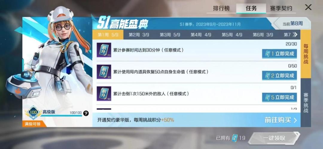 在赛季契约的任务面板中,可以查看每周挑战和赛季挑战。完成这些任务就可以获取大量赛季积分。