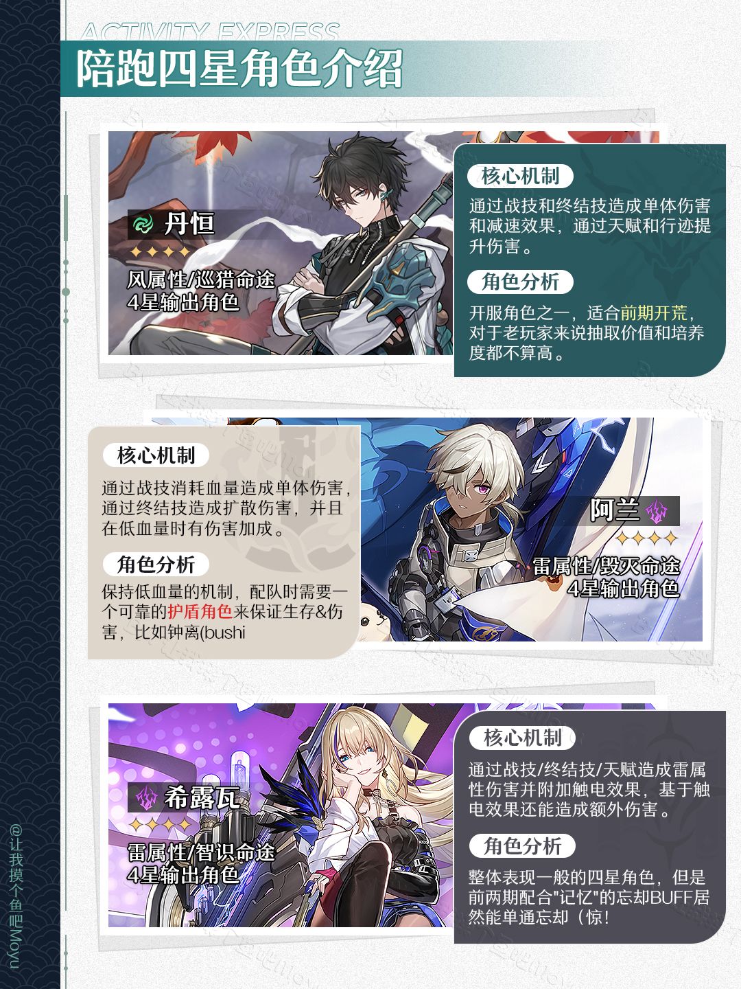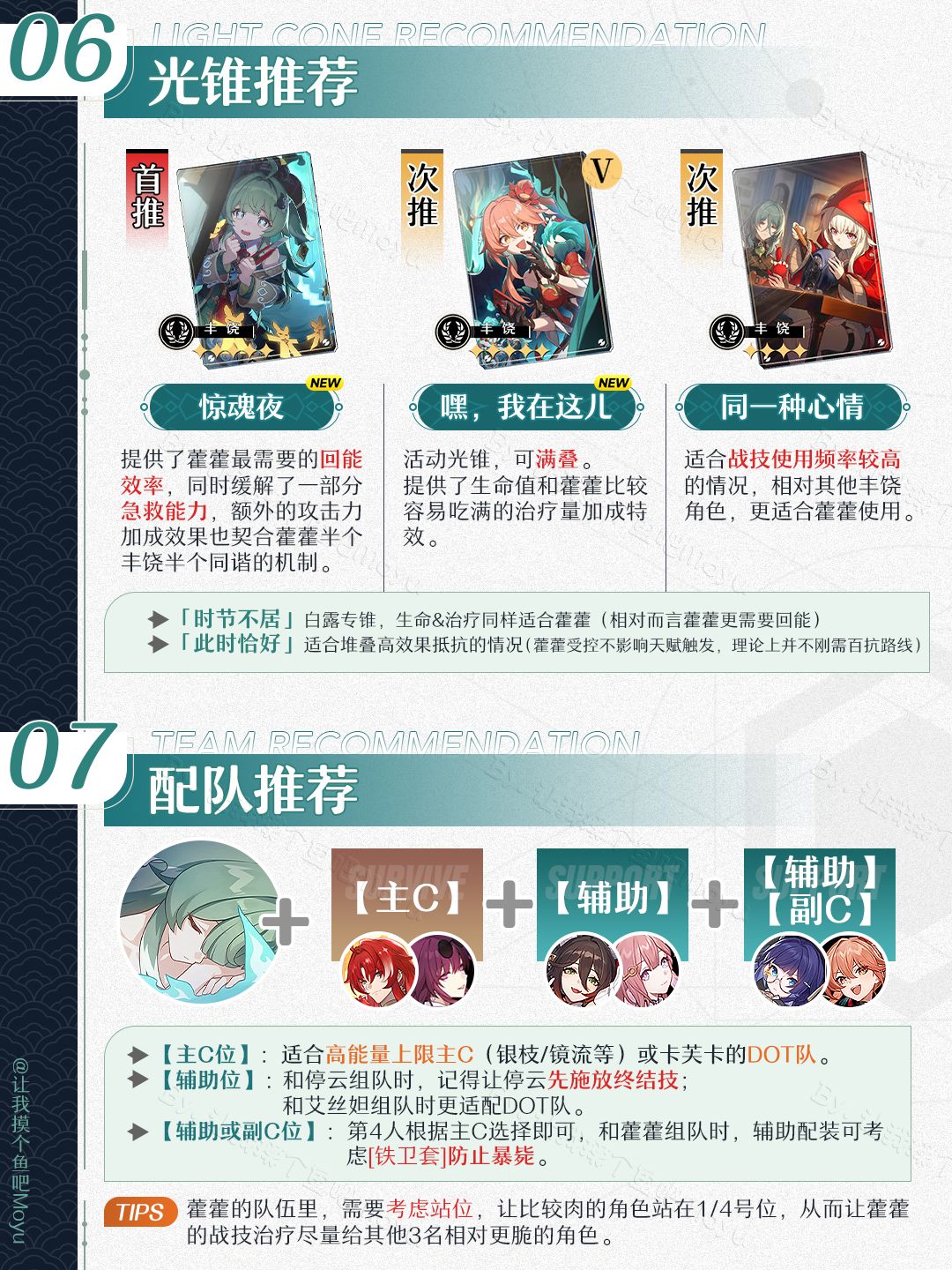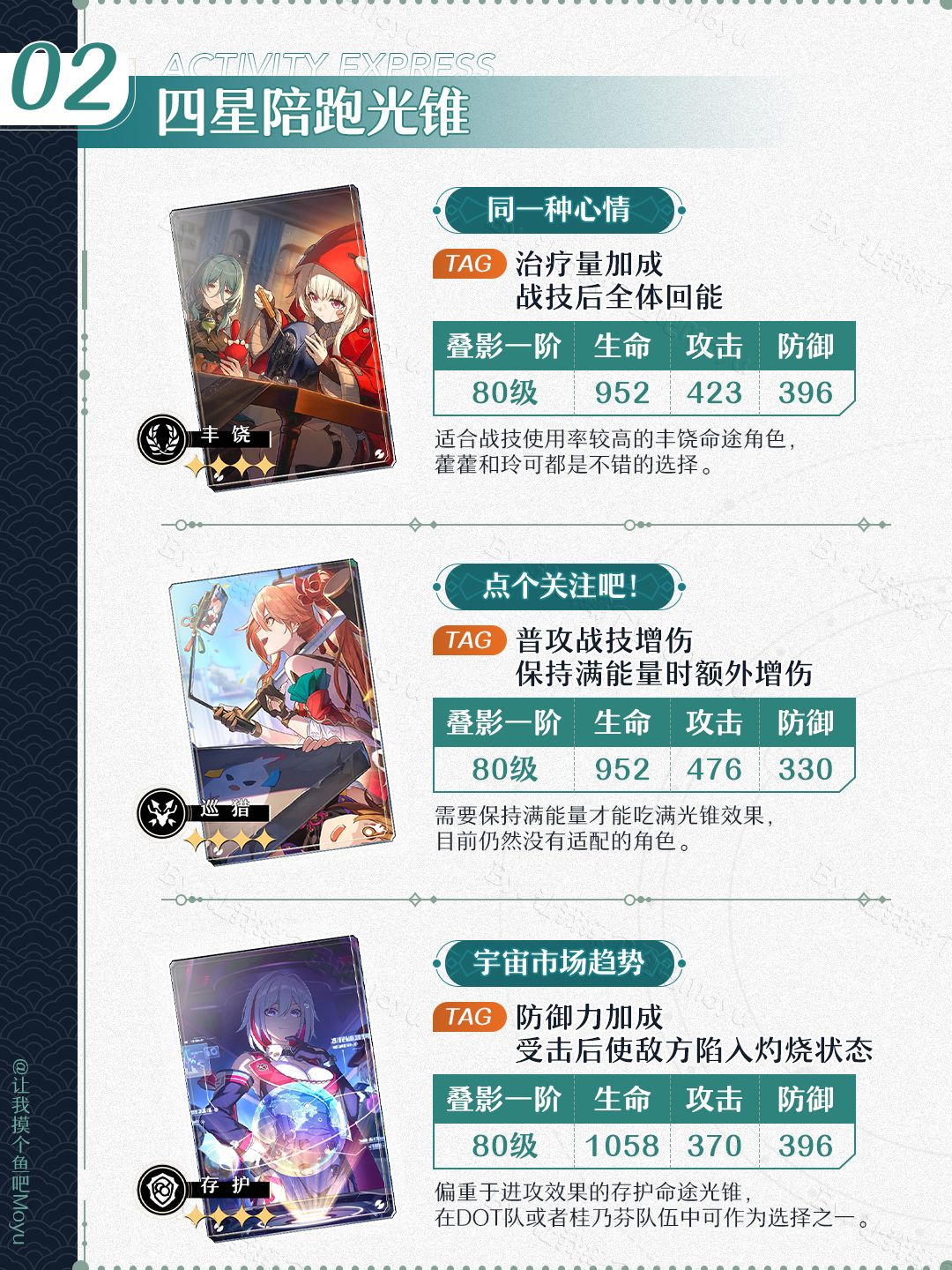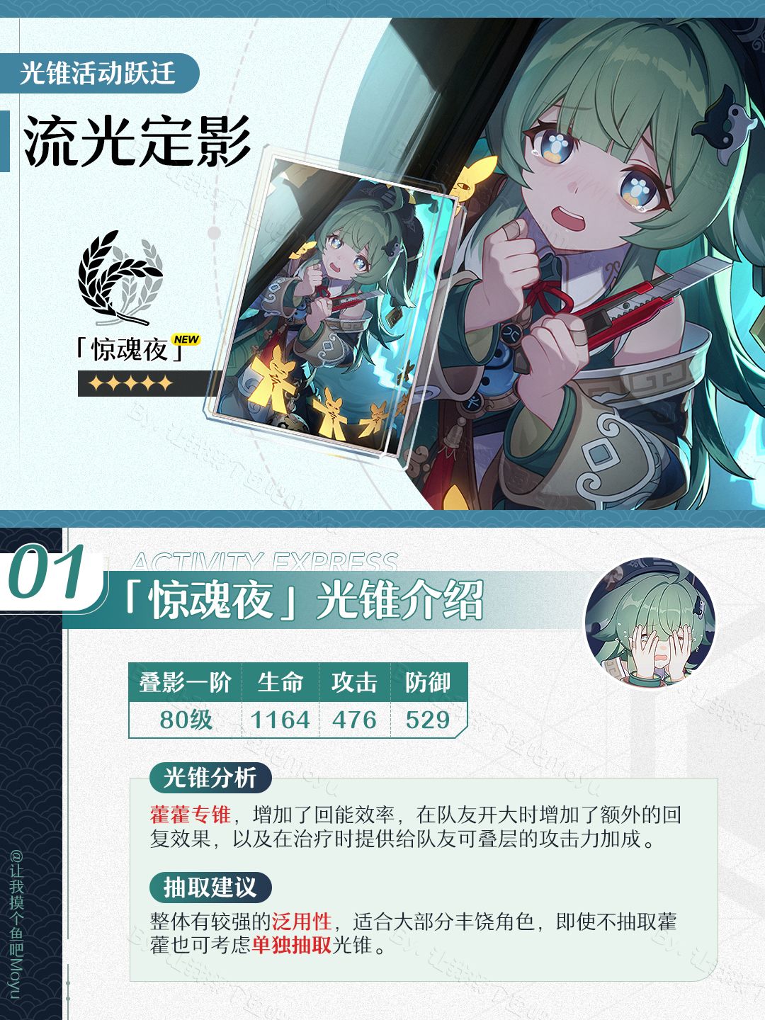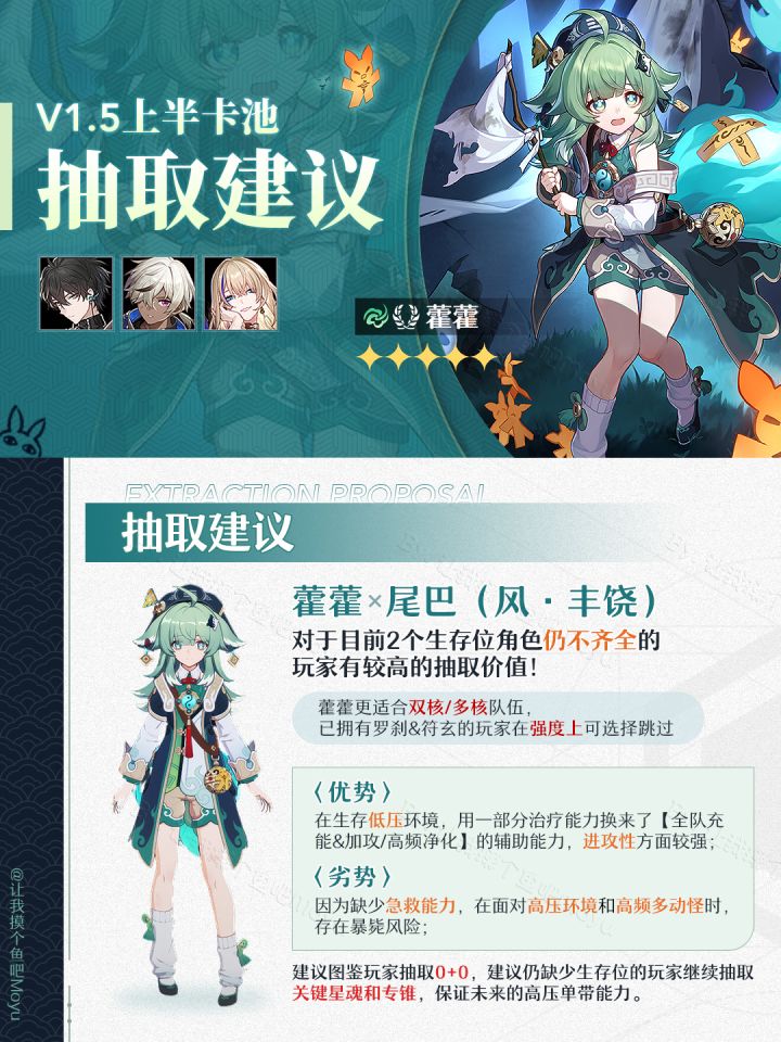 将将!摸鱼来啦~ (。•̀ᴗ-)✧这次给大家更新了崩坏星穹铁道,1.5版本上半卡池即将上线的『尾巴?尾巴?·藿藿』卡池的抽取建议;文中包含了【角色卡池/光锥卡池】UP5星&陪跑4星的信息。—————— ฅ՞• •՞ฅ ———————🔘制作不易,严禁任何商业性转载及搬运,转载需标注攻略出处喔🔘制作难免会有错漏,希望大家多多提意见,我会及时修正(贼听劝🔘欢迎评论区友好交流,看到都会尽力回复哒~🔘最后祝大家都能十连双金!
