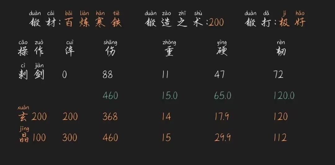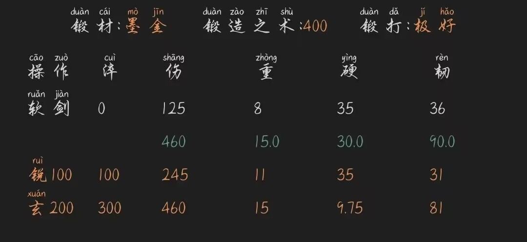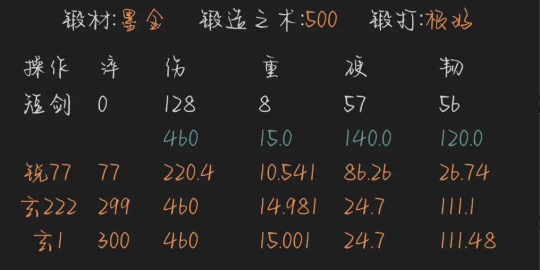 - 长剑(2铸)千锻:460伤 17重 120硬 140韧