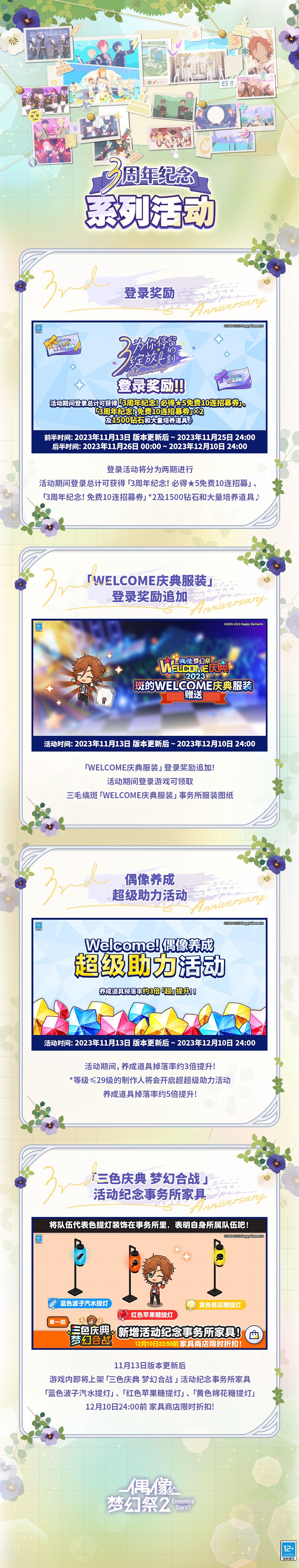 11月13日版本更新后~ 12月10日24:00活动期间,偶像养成超级助力活动开启!养成道具掉落率约3倍提升!