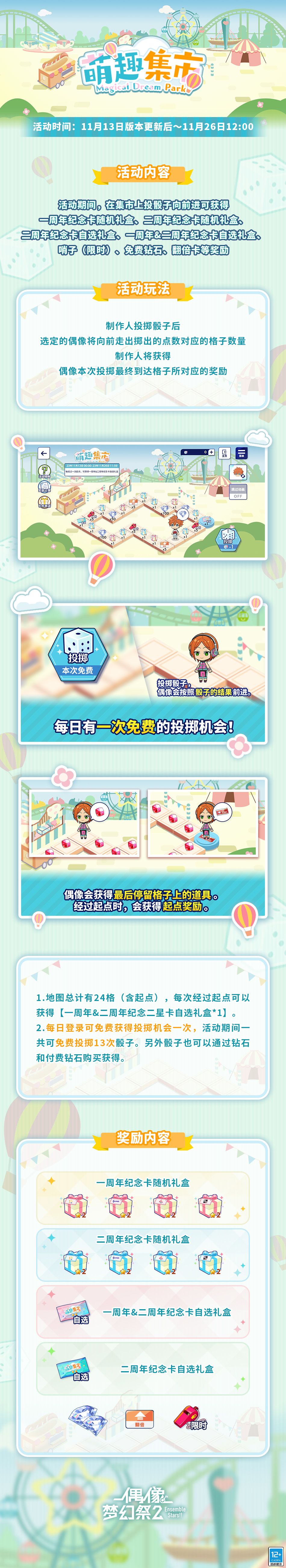 ▶小偶像在地图上移动和掷出的点数一致的步数,获得到达地点的奖励,在地图上制作人将有机会获得【一周年纪念卡随机礼盒】、【二周年纪念卡随机礼盒】、【二周年纪念卡自选礼盒】、哨子(限时)、免费钻石、翻倍卡等丰厚奖励!