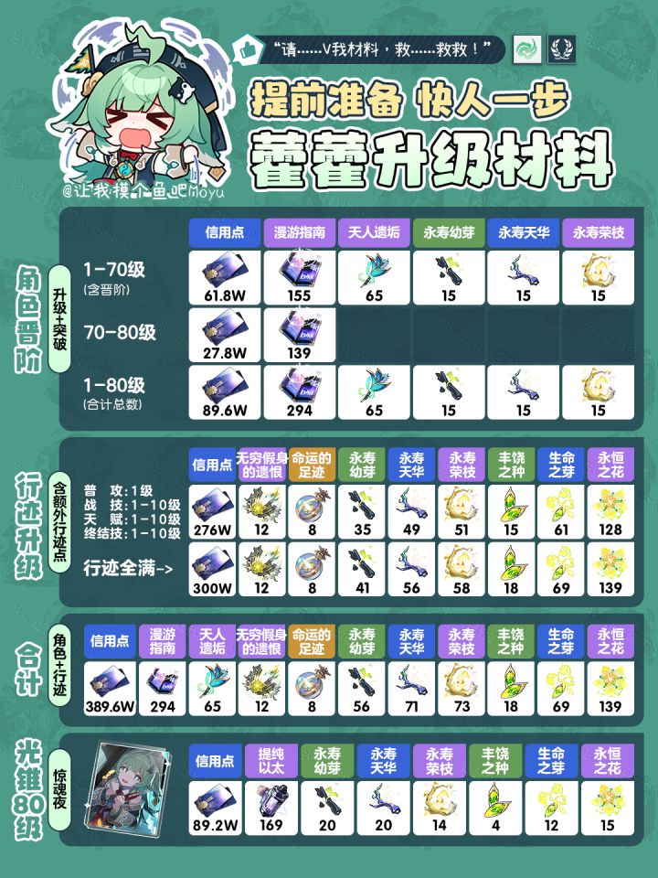 将将!摸鱼来啦~ (。•̀ᴗ-)✧今天给大家带来1.5上半即将上线的限定五星UP角色『尾巴?尾巴?·藿藿』的角色&行迹&光锥材料全收集准备抽取的同学速速收藏起来吧!“请......V我材料,救......救救!”—————— ฅ՞• •՞ฅ ———————PS:【角色晋阶部分】按照1-70级(含突破材料)/70-80级/1-80级总合计材料展示【行迹升级部分】按照摸鱼推荐的高性价比方案展示:普攻1级/战技10级/天赋8级/终结技8级(含所有额外行迹材料)