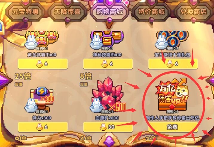 必买礼包:三星圣剑礼包、神魔石礼包、体力礼包、传说典籍礼包、钥匙礼包、魂珠细沙礼包 共计21+21+6=48兔兔金元宝