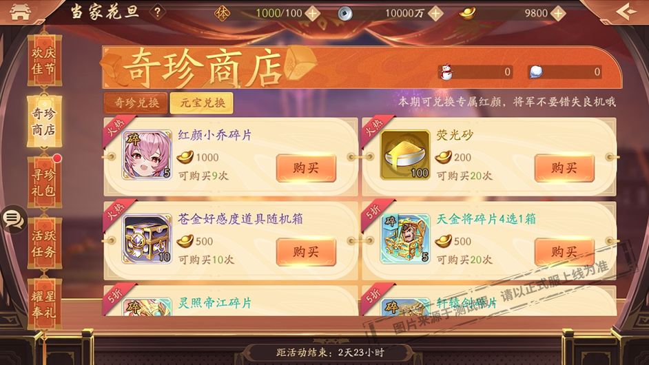 活动期间,少年们可以消耗元宝直接购买指定数量红颜小乔碎片、荧光砂、苍金好感度道具随机箱、天金将碎片4选1箱、灵照帝江碎片、轩辕剑碎片、赤金碎片选择箱(六)、紫金碎片选择箱(六)、终极命星随机箱、星宿凝晶、唤灵石、兵书残卷、高级养成资源选择箱和基础养成资源选择箱等稀有资源。