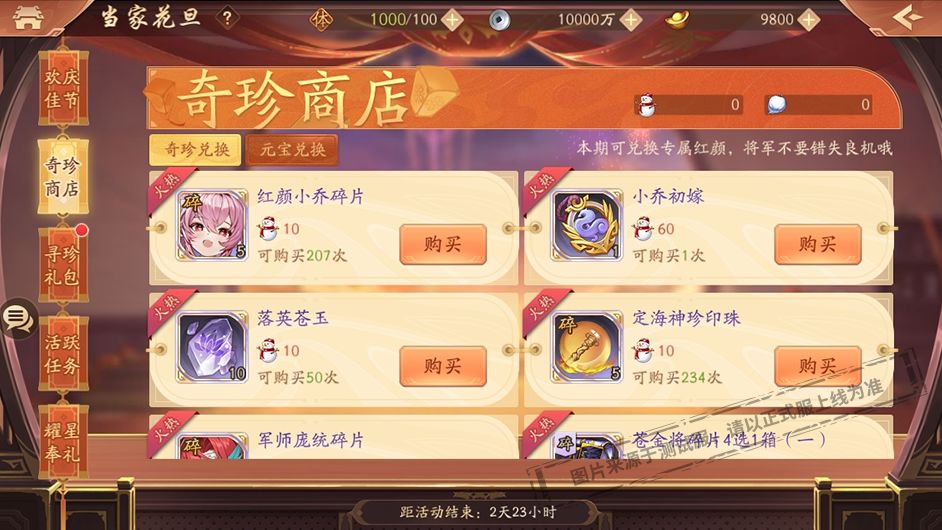 玩家可用充值获得的限时道具“雪人”在奇珍兑换中兑换红颜小乔碎片、苍金称号-小乔初嫁、落英苍玉、定海神珍印珠、军师庞统碎片、苍金将碎片4选1箱(一)、齐天大圣印珠、苍金装备碎片选择箱、天金神兽碎片6选1箱、天金红颜碎片6选1箱、天金神兵碎片6选1箱、天金战法碎片6选1箱、天金军师碎片6选1箱、天金将碎片20选1箱、金箍棒碎片、至尊宝碎片、天金兵符碎片箱(一-四)、天金装备碎片箱、全赤金碎片、琉璃玉令、鬼谷秘卷、兵阵图、唤灵玉和天命天珠选择箱等珍稀奖励。