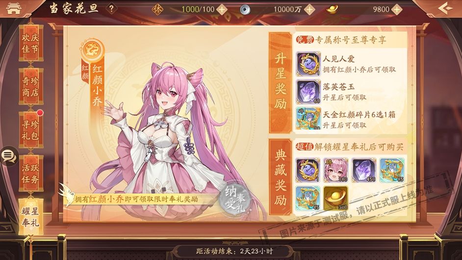 活动期间拥有红颜小乔均可解锁并领取限时奉礼奖励,专属称号至尊专享。升星红颜小乔将解锁更多奖励,切莫错过。
