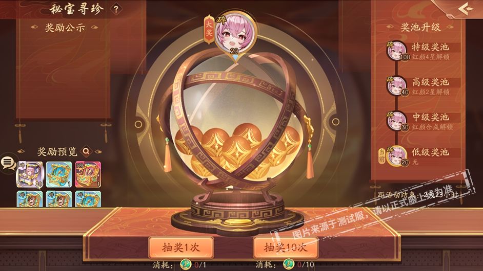 每轮秘宝寻珍都有五个奖池,活动开始后默认初始奖池,当达成奖池解锁条件后,奖池会自动升级。