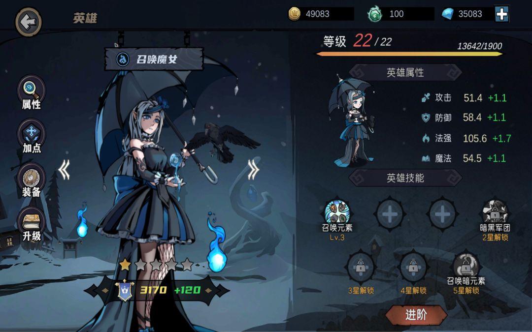 副英雄:召唤魔女(技能优先满级,召唤宝宝当肉盾)