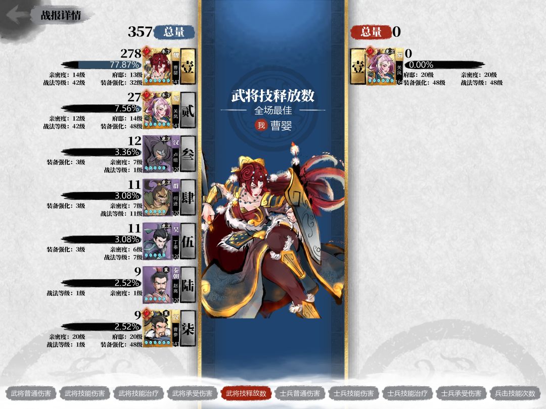 为避免武将自身攻速加成的影响,本次测试选择曹参为研究对象。曹参武将技无攻速加成,将战法回退到1级,战法的影响也可忽略不计。