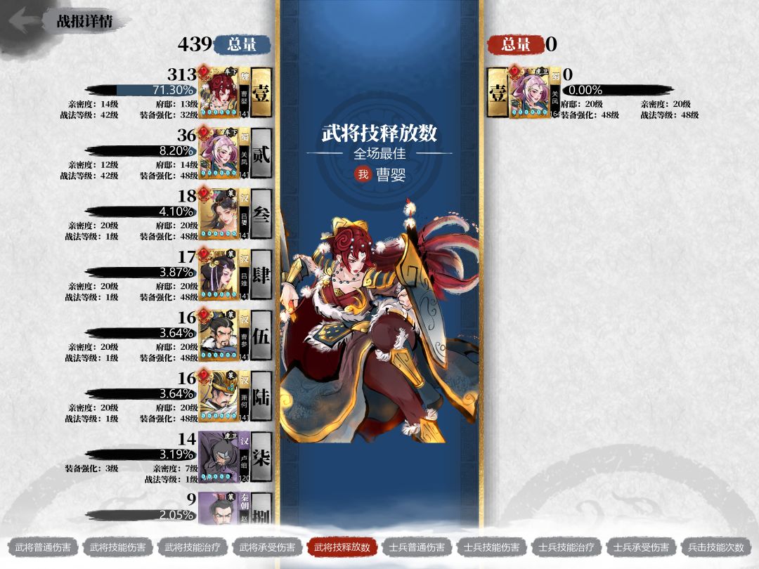 如图所示,曹婴在240秒的对局中释放了313个技能,平均每秒钟获得130怒气。