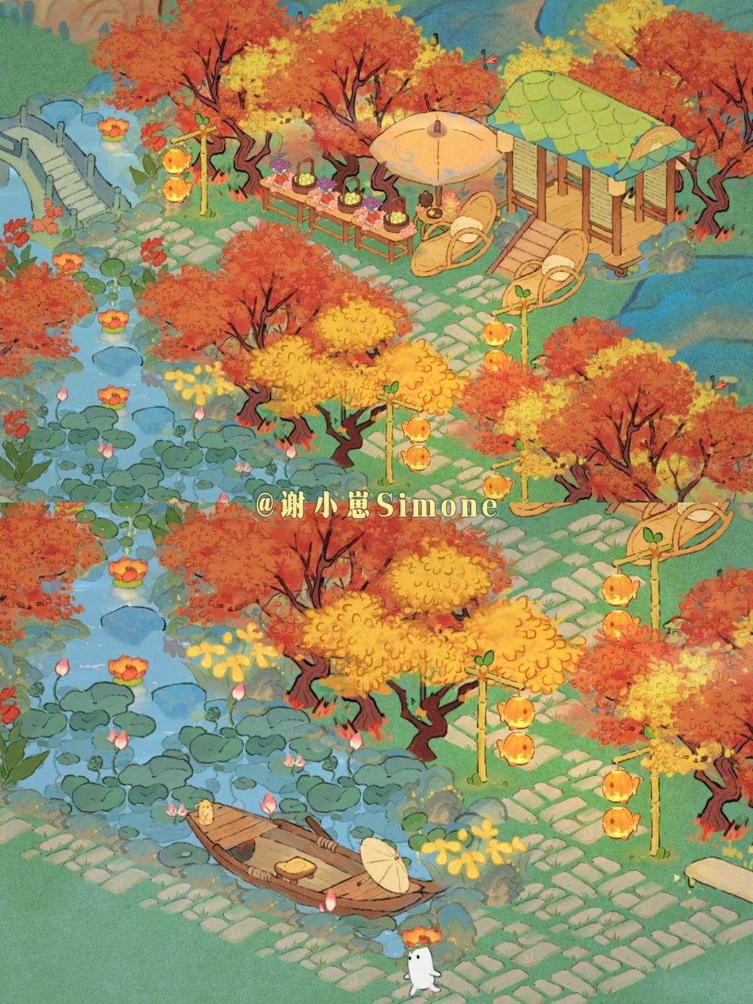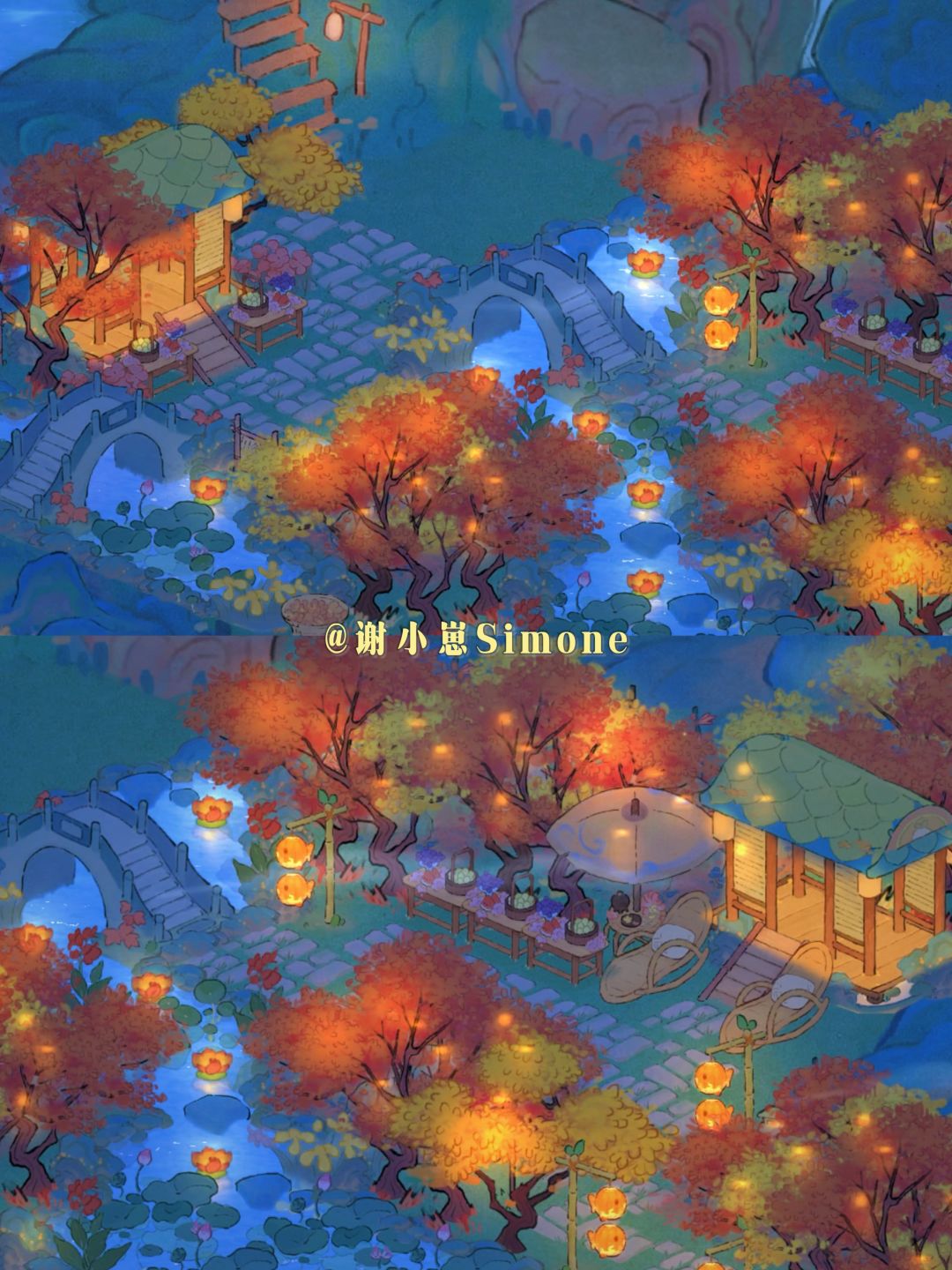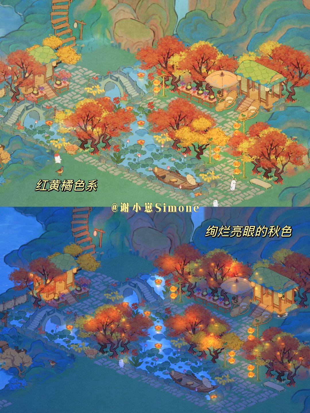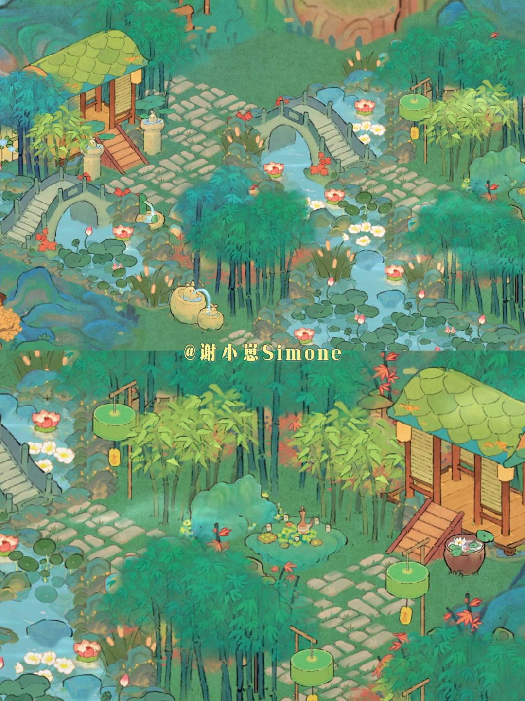仙女湖陆地入口位置的景观,也可以放在其他岛屿。山灯竹影放在植物后面,晚上很像林间萤火。(两种布局地基一样,通码头亦通岛内)