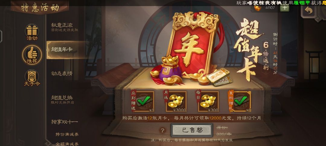 年卡消费198 满签144000元宝 充值比例1:727 在此基础上如果是去年也买了年卡的玩家 还能再追加两张满减券