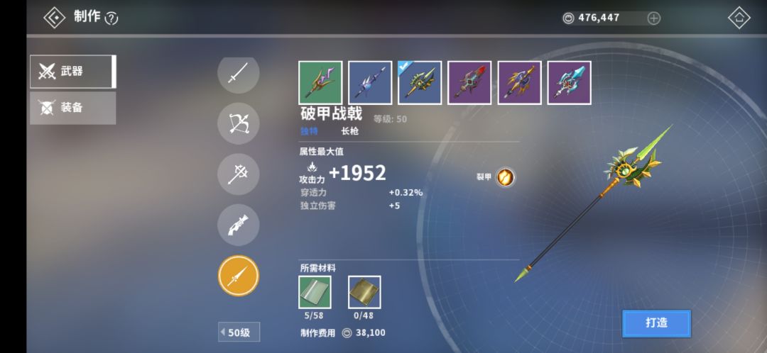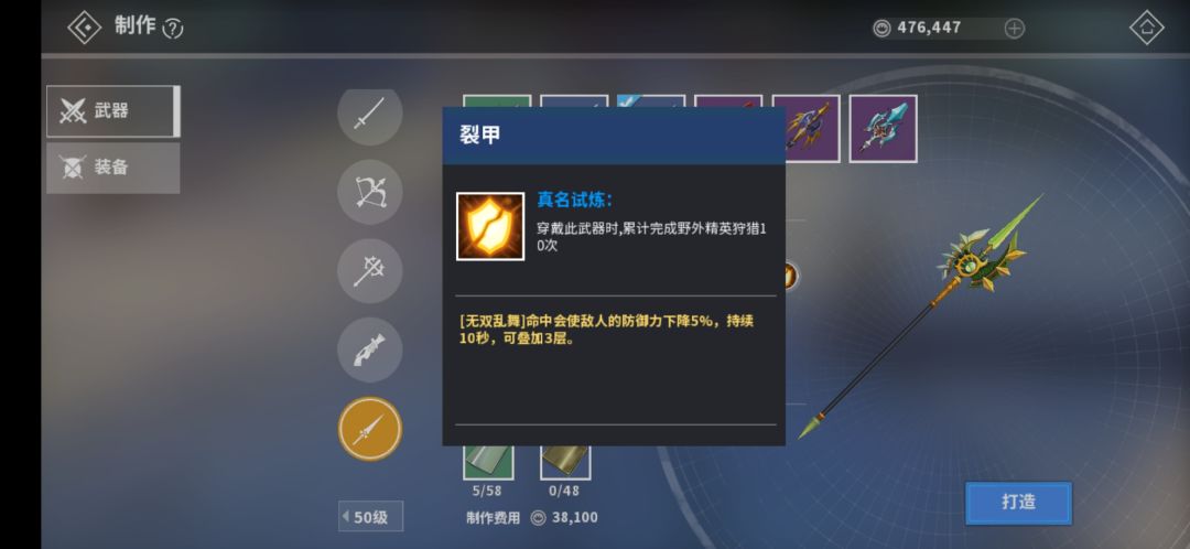 50级破甲战戟:【无双乱舞】每段命中触发5%破甲,可叠加三层