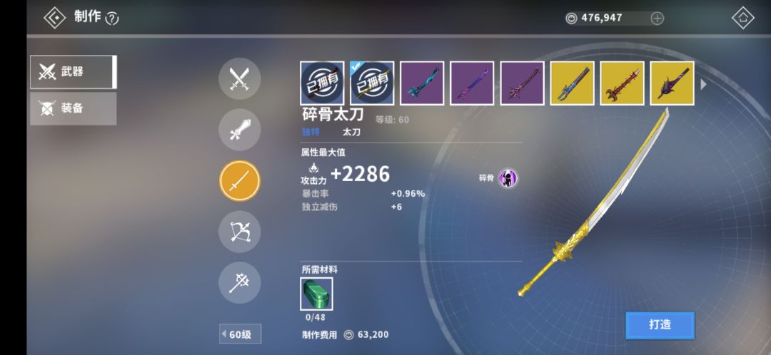 萌新蹭车-破防武器:30级太刀--赤色绝影、60级太刀--碎骨太刀(优先造30级赤色绝影,60级碎骨太刀等冒险爆一把就行,两把武器切换可以叠加破甲效果)