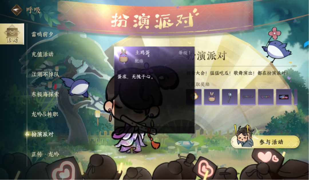 1.派对玩法。位置:呼吸,扮演派对,参与活动。每天五分钟,可以随机获得饰品外观,玫瑰花啊,土鸡蛋啊,花仙棒啊,CPDD啊什么的都很不错。