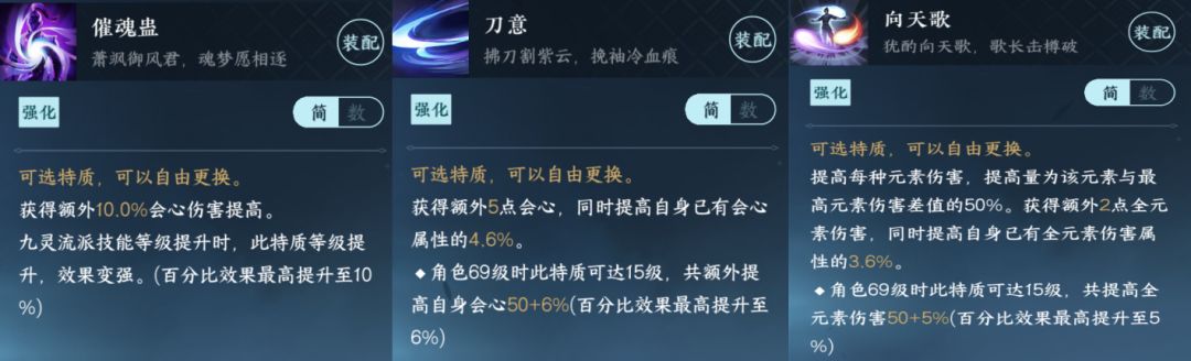 小特质推荐搭配:催魂蛊提升效果可以获得会心伤害提高--向天歌提高自身元素伤害属性--刀意提高自身的会心属性。