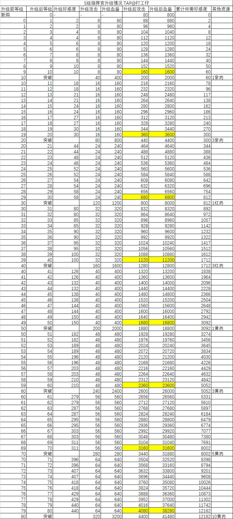 注3:本表为基础攻击力80的S指挥官的表。每个指挥官基础攻击力略有不同,例如恶之花为84;同时,每次指挥官升级会增加1级攻击力的50%,因此可能和该表略有出入。
