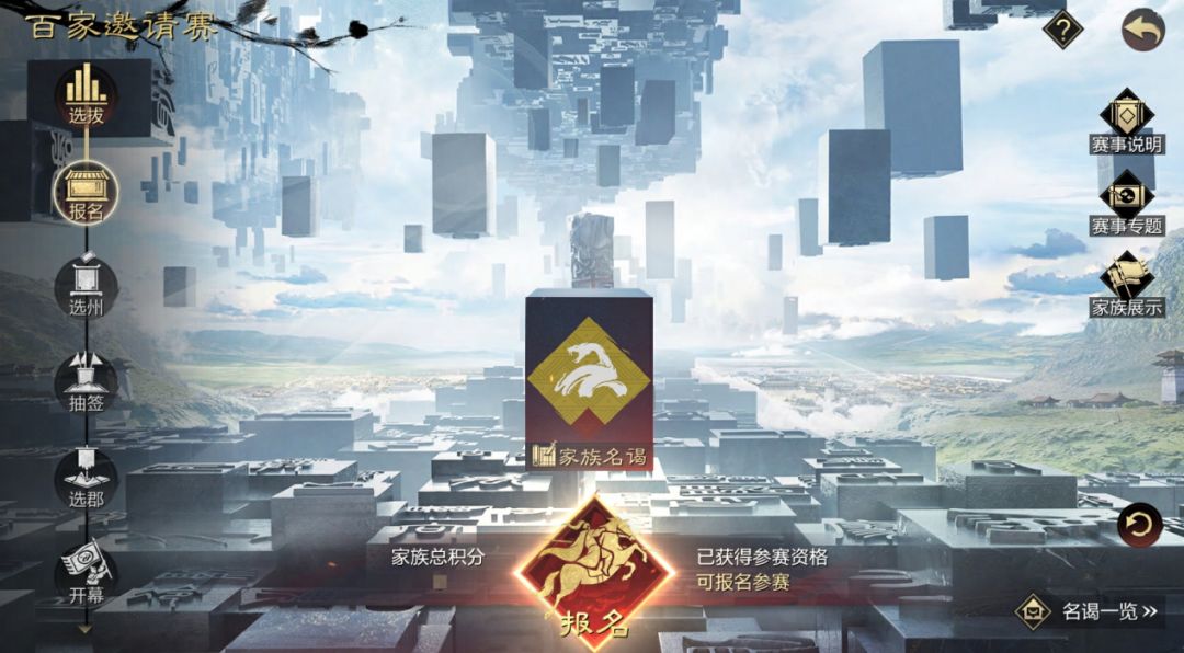 主公们将选择期望起兵的阵营,相同阵营的家族积分将计算总和,按照从高到低的顺序给九个阵营抽签,确保每个阵营的家族为报名总数的九分之一。投入积分越高,落州可选空间越大,但并不是百分百落到心仪州。赛前通过“外交手段”的盘外招,在此次邀请赛中会极力避免。