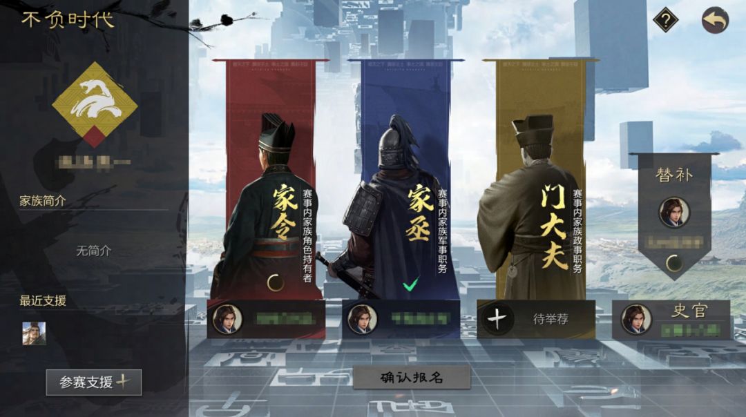 2、报名阶段开始后,如果我们获取了报名资格,家主需尽快在赛事活动页举荐3名参赛人员和一名替补,当然需要被举荐人同意后才可以代表本家族参赛。参赛人员需要慎重考虑,战力强弱只是基本,游戏理解、参与时长更是关键。