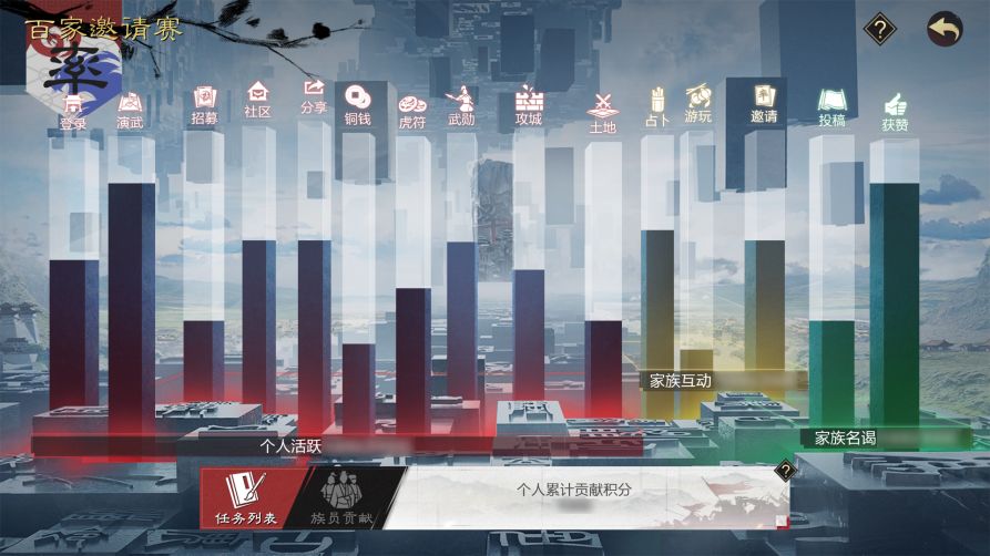 个人活跃:只要进行了每日登录、演武、虎符招募、分享邀请赛,甚至是铜钱、虎符使用值,都能获取海量积分。家族互动:则是通过家族游戏、占卜等常规玩法即可获取。