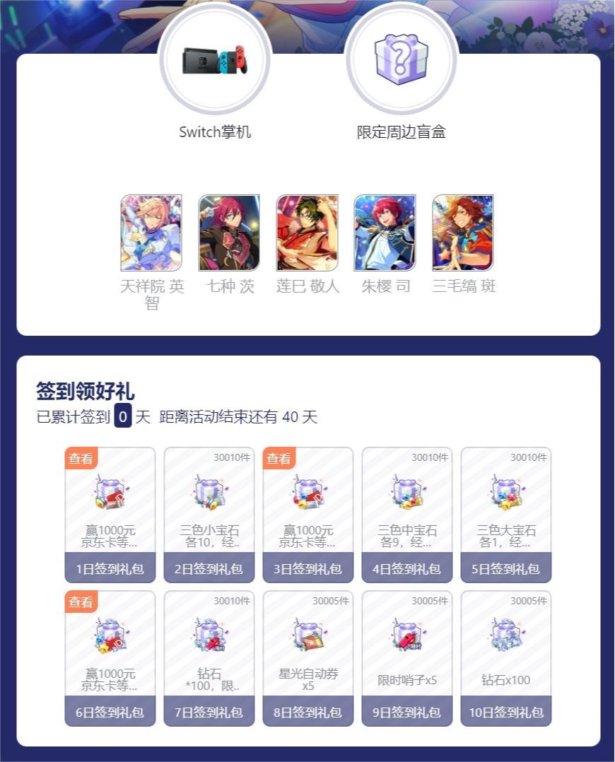 在游玩新版本的同时,也欢迎各位制作人来Taptap《偶像梦幻祭2》社区参与签到活动,每日签到都可领取限时礼包并有机会抽取千元京东卡,集齐指定卡片还可兑换三周年限定周边和Switch掌机等大奖哦~