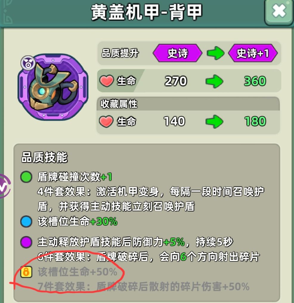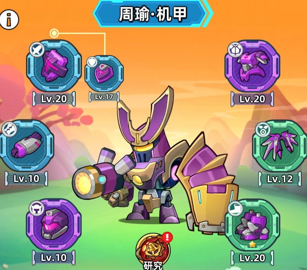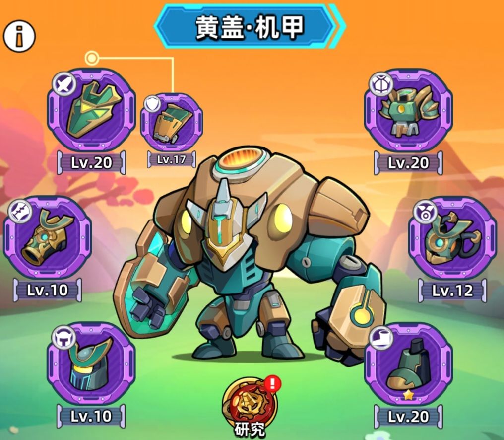 由此可以得出机甲的正确升级路线,第一步把躯干、背甲、腿甲逐个逐个升级到黄色,把每件开出50%血量增加。第二步把机甲其余部件拉到紫色激发套装特效,第三步在升黄攻击左四样部位。研究天赋树优先血量顺带防御力3级,这样150%血量会比武将肉了,吃鸡可以抵御变猪了,其他攻击天赋一点不升,除非你可以保证不挨揍,那样可以试试先升攻击。