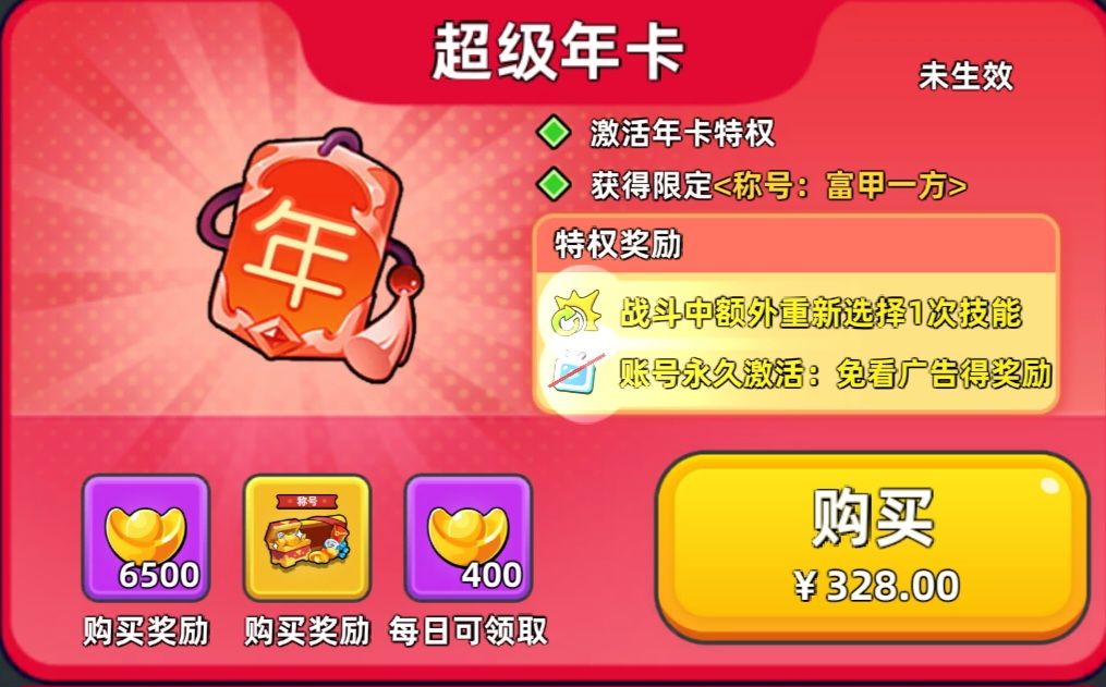 1、年卡:0.89/天,非常便宜局内多一次刷新,卡技能有优势