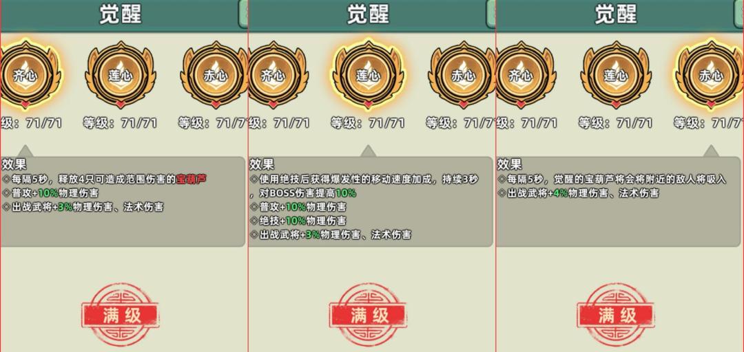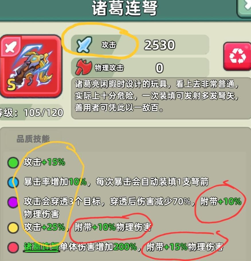 2 、武器装备:装备栏左侧四样(双武器、头盔、项链)是加攻击力的,有阵法后可以转化出一些属性攻击,右侧三样是加血量的,所以前期银币不够可以放弃强化右侧三样,只有局内的桃子和天工护腕是血量收益最高的,衣服护腕鞋子上少强化几十级影响并不大,另外左侧装备词条增加25%攻击力指的是基础普通攻击力增加25%不是总攻击,这些要清楚,但所有武器和技能的法、物攻击属性都是从普通攻击换算出来的,属于正相关。(44天金色置换)