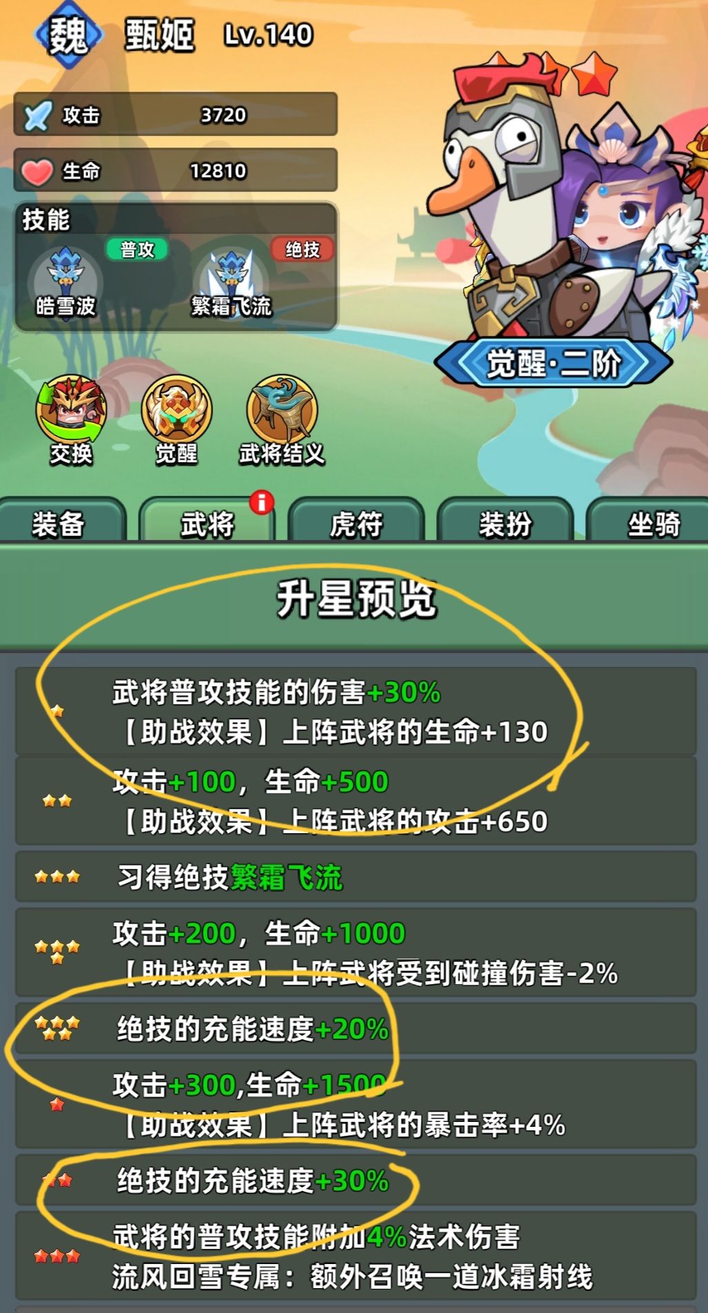 额外说下甄姬: 甄姬人称小吕布,红将以下甄姬最强,她的强度仅次于白板红将,虽然没有红将额外100%暴击伤,但甄姬有增伤30%,目前经过测试减速增伤对小怪、精英、boss均有效,这游戏主线和精英的减速效果很容易覆盖,例如寒冰剑、长林项链、技能昊雪波、飓风、琴、减速类宠物,那用甄姬走物攻、召攻路线也是可以享受到30%增伤效果的。只是甄姬10星前昊雪波不能超五,但昊雪波的武将技能也是紫黄武将里最高的无论是单体还是群攻,甄姬大招cd时间是最短的,大概1分钟10秒一次大招,配合结义技能每分钟都可以打一波爆发,突围杀精英非常顺手。大招只是看着弱实际上很强,特别是被小怪围攻时输出效果比孙尚香强,因为孙尚香是全屏扫射,而甄姬是逐个方向猛攻,配合走位可以把大招都倾斜到同一波敌人身上,更容易在被围时打开一个缺口,这一点是孙尚香全屏扫射是做不到的。