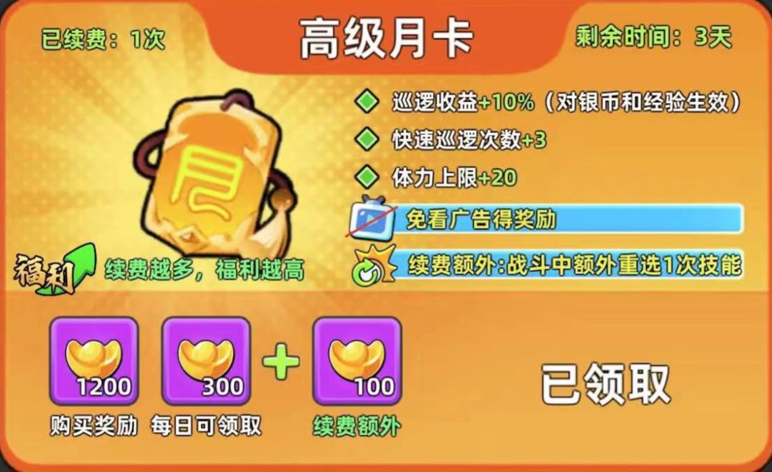 3、高级月卡:2.2/天,增加三次巡逻和10%经验和银币收益,体力额外消耗45。总体而言高级月卡感觉性价比不高,但连续续费后会有额外局内刷新1次的激励还算凑合。新玩家首月可以开这个,感觉喜欢玩的话就只开个年卡