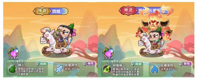 1.四娃属于火娃可以喷火,神话四娃附带了火神祝融的幻化,可以轻易的对敌人造成易伤效果,而传说四娃只是喷火没有附带效果,而神话四娃的收藏属性是法术攻击,传说四娃只是普通攻击!