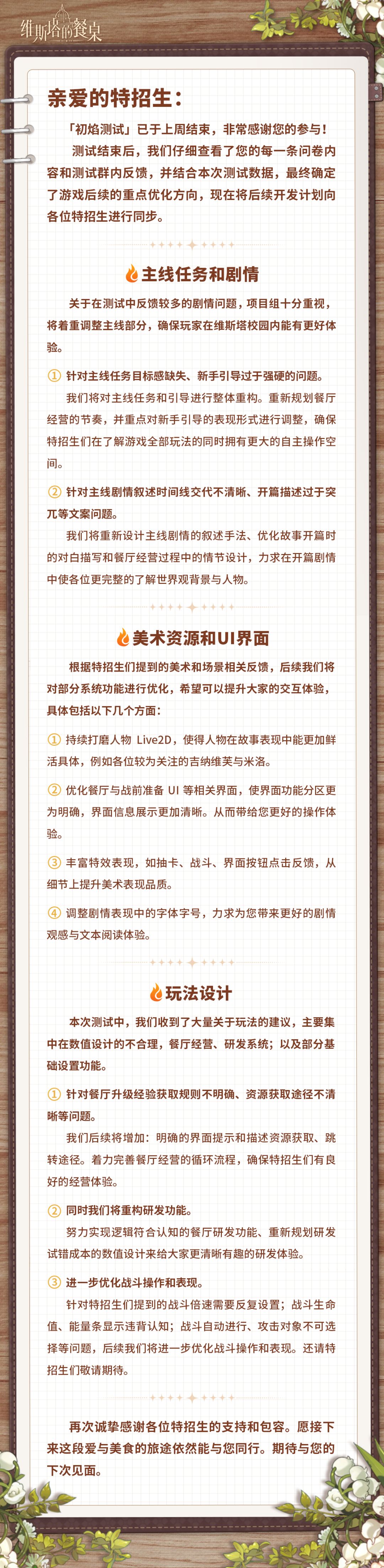 《维斯塔的餐桌》小规模限量删档保密测试「初焰测试」已于上周结束。我们仔细查看了每一条问卷内容及测试群内的反馈,并结合本次测试数据,最终确定了游戏后续的重点优化方向,现将后续开发计划向各位特招生进行同步,详见如下长图。