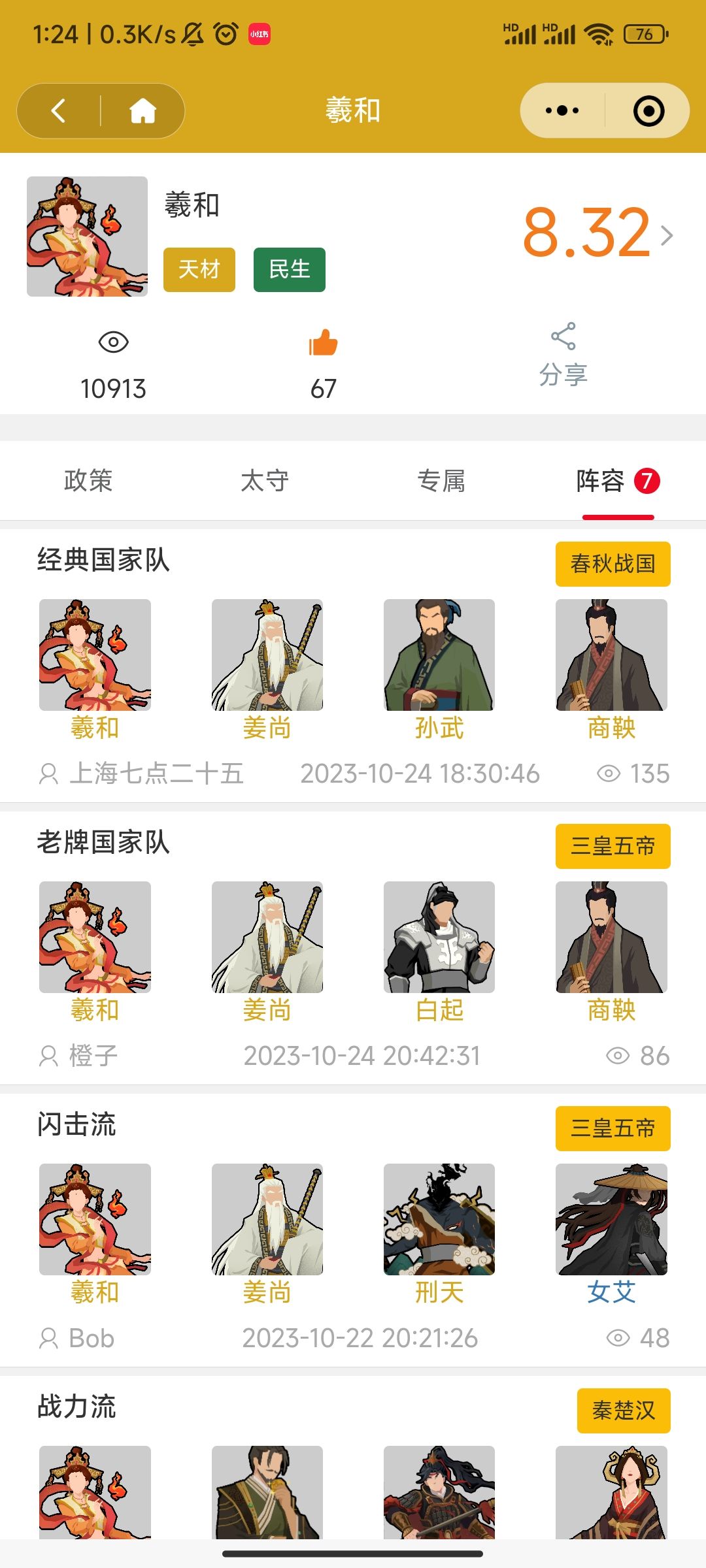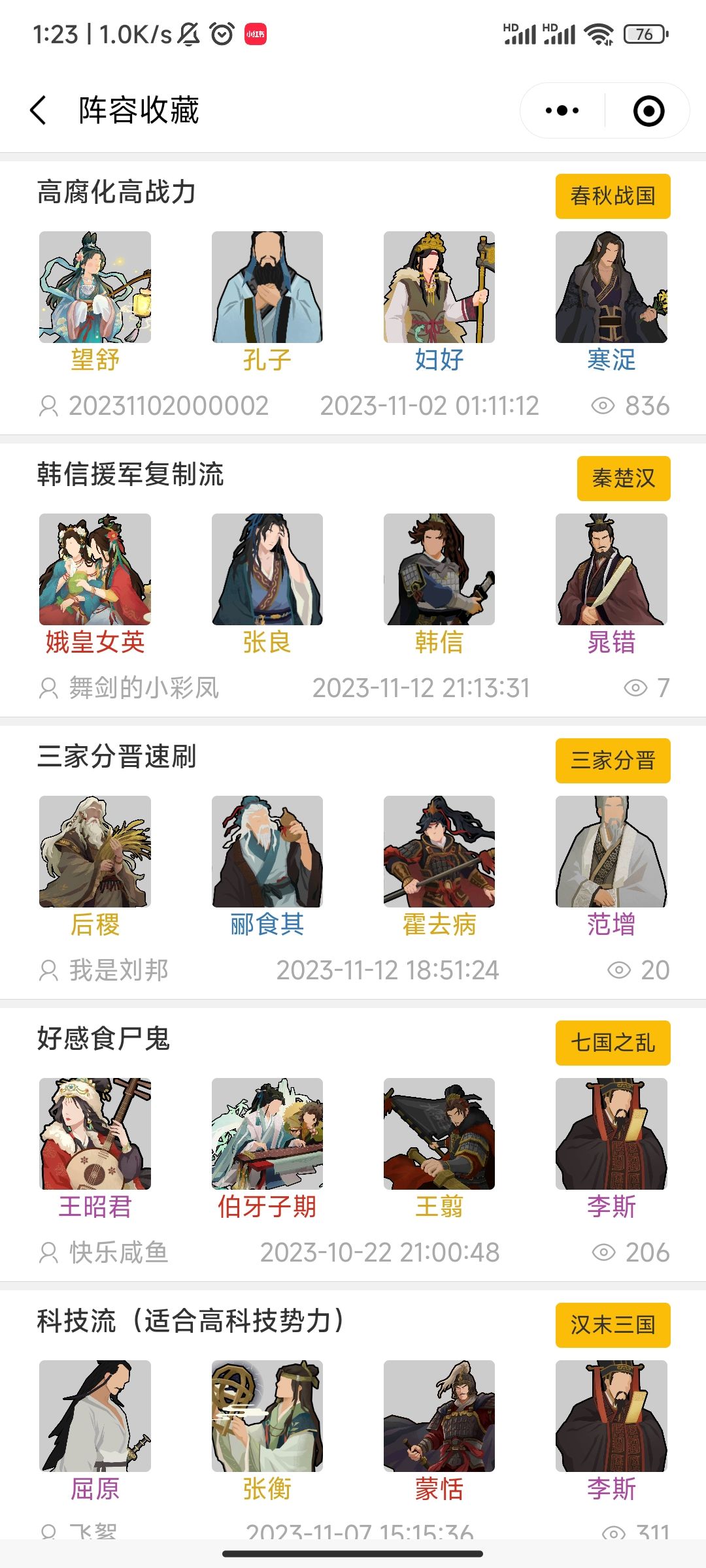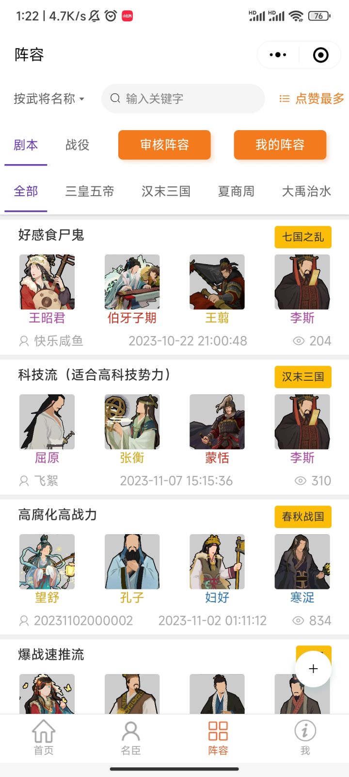 2.名臣阵容列表:主页面展示名臣阵容卡牌包括阵容名称,名臣搭配,适合剧本/战役,发布人,发布时间,浏览量。顶部Tab导航页可以切换查询不同剧本/战役的阵容,支持模糊搜索队伍名臣,按名臣搜索阵容。