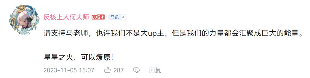 UP主“马凯三世”的粉丝量当时还不到1万,这条视频的播放量也“只有”5万,或许这时还是会有玩家觉得这样的“威胁”或许并不能让官方做出什么改变,但是正如评论区说的那样,星星之火,可以燎原。