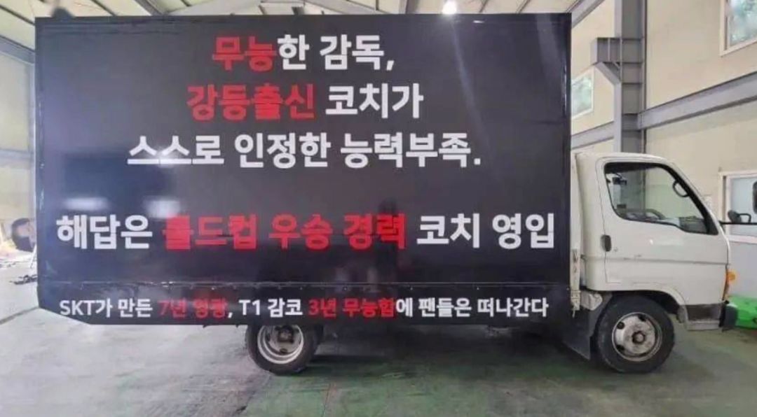 去年他们就因为联赛成绩差劲,粉丝退一步越想越气,最后按下了禁忌的按钮,叫来了泥头车,上面滚动播放各种抗议,然后就这么直挺挺地停到了T1俱乐部楼下。