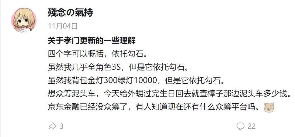 就在《第七史诗》宣布加入“潜力觉醒”系统后的第二天,UP主殘念の氣持发布了一条动态,表示想“众筹泥头车”。