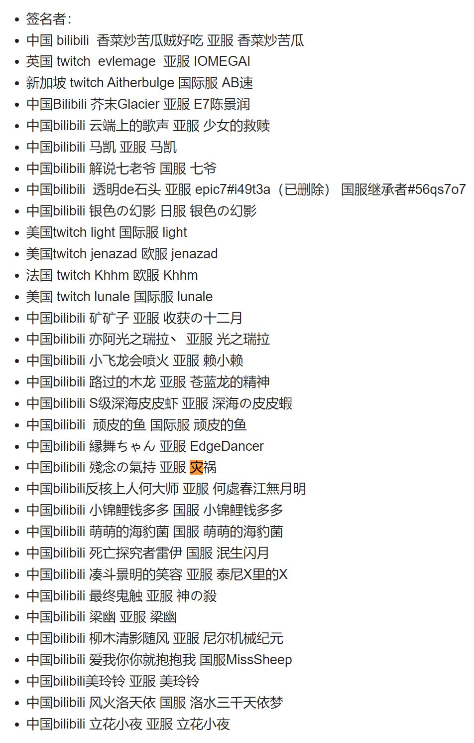 很快,几十位国内外主播纷纷签署了联名信,虽然他们不是那种百万粉丝的“大UP主”,但这些主播在《第七史诗》这个游戏的玩家群体里有着重要的影响力,甚至可以说这些主播的粉丝是游戏的基本盘,如果这些主播联合起来号召玩家退游,官方的损失将无法估算。