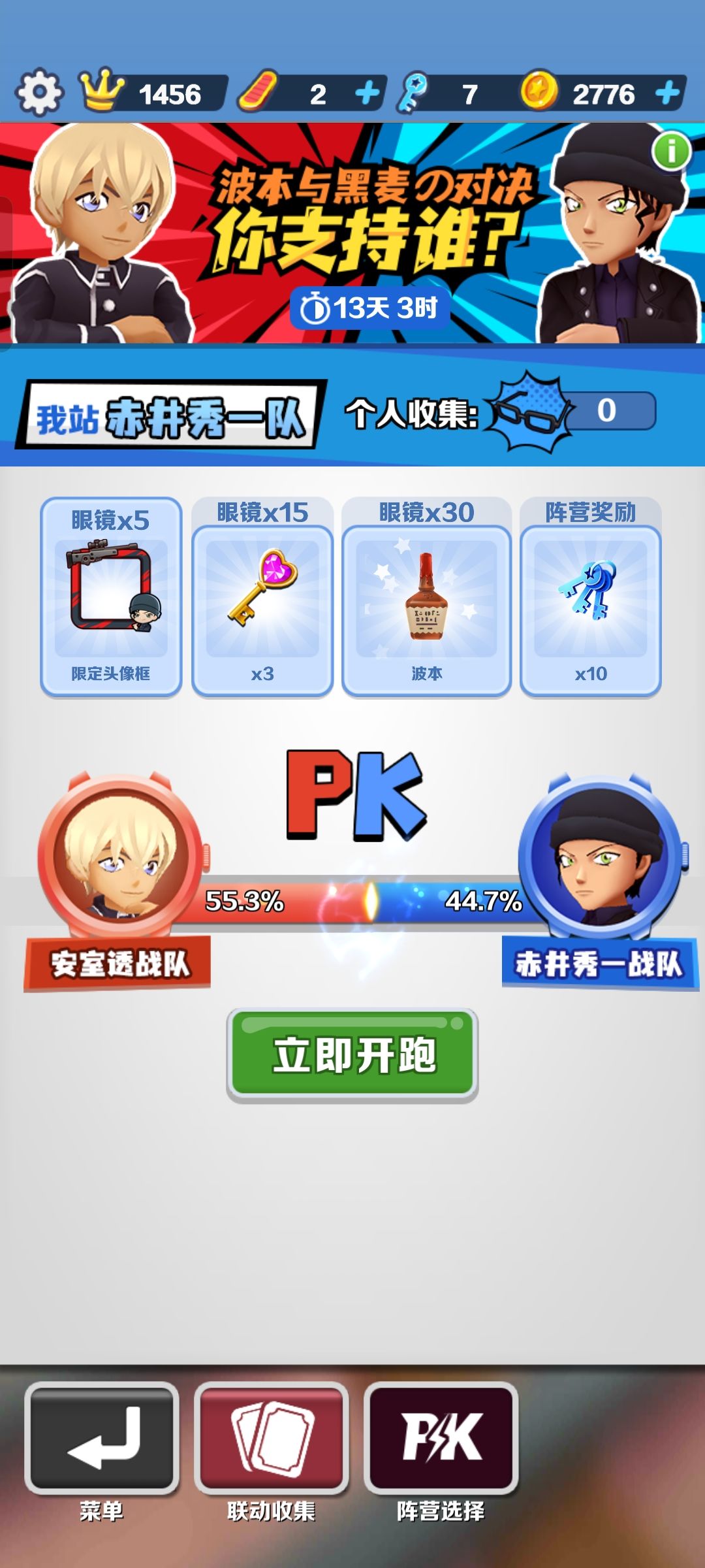 在陈营对抗中,通过收集眼镜可获得头像框和波本。收集5个即可活动限定头像框,30个可获得背饰波本