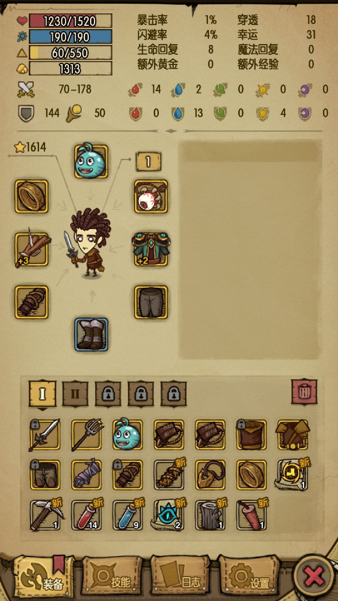 0~20:开局升级点3次攻击,学吸虹,然后升级点幸运。11~20摸把大型暗器或者工匠之力,最大攻击到150左右,吸虹嗑药莽过魔像。