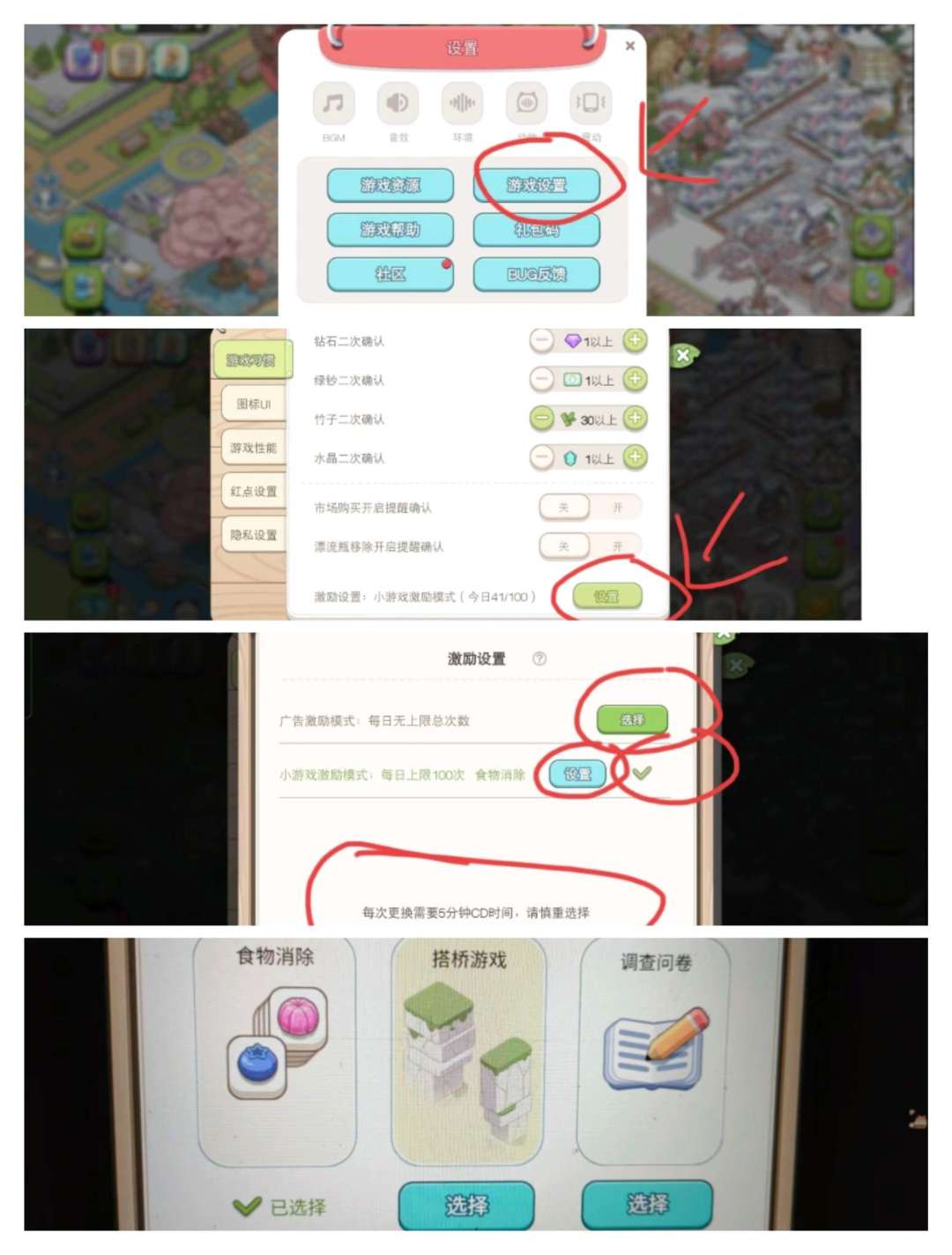 ①激励分为小游戏和广告模式,如图可以更改模式,更换cd仅为五分钟,可根据需求随时更换。小游戏模式还可以在设置里固定选择某个小游戏(推荐羊了个羊,熟练了五六秒速通)