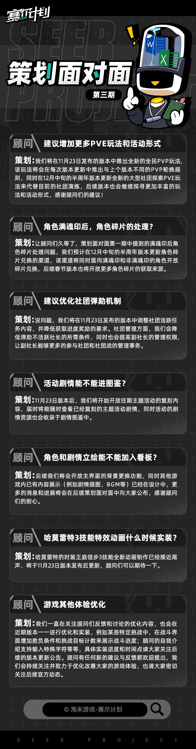 距离上一期【策划面对面】又过了一段时间啦,顾问们积极踊跃的反馈对于制作组打磨游戏有极大的帮助,制作组会悉心听取来自大家的建议,争取为大家带来更好的游戏体验,皮皮替策划捎来了最诚挚的感谢,以及全新的回信~顾问,一起来看看吧!